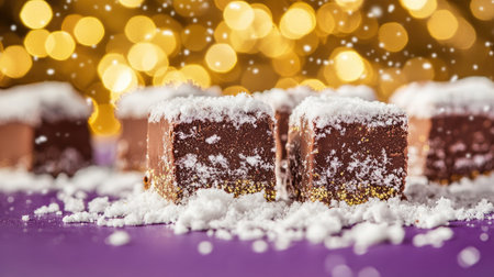 A delightful scene featuring rich chocolate treats dusted with snowy sugar, set against a vibrant background, evoking a festive and cozy winter mood.