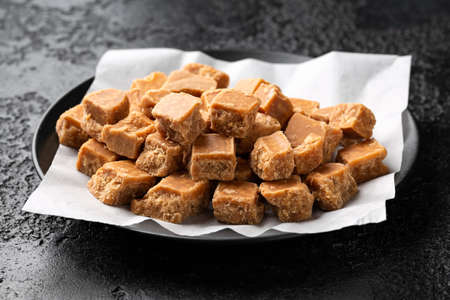 Top view of caramel vanilla fudge candies on a black textured ceramic plate over dark wood table. Fresh tasty chewy bonbons made of milk and sugar. Square pieces of delicious soft sweets. Close-up.