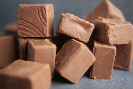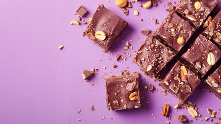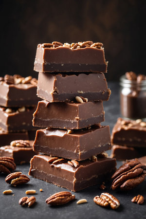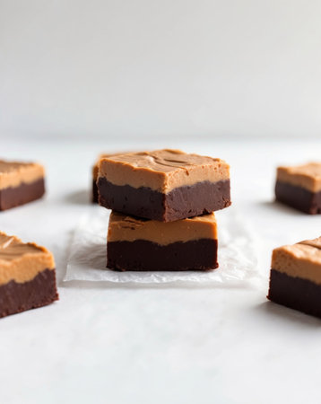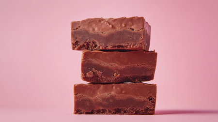 Sweet and indulgent chocolate fudge stacked against a soft pink background, perfect for highlighting desserts and treats in culinary or confectionery contexts.