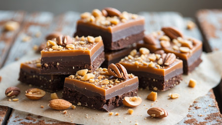 AI Generated. Delicious Layers of Chocolate Caramel Treats with Crunchy Nuts Perfect for Dessert and Sweet Snack Inspiration on a Rustic Wooden Surface