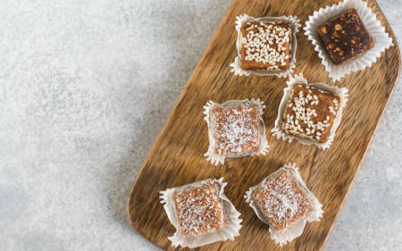 Handmade healthy vegan sweet candies on wooden cutting board. Copy space.