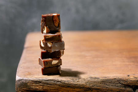 Stack of homemade toffee salted caramel chocolate almond nuts candy on wooden table. Handmade food sweet gifts for any holidays. Copy space