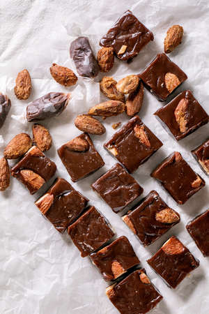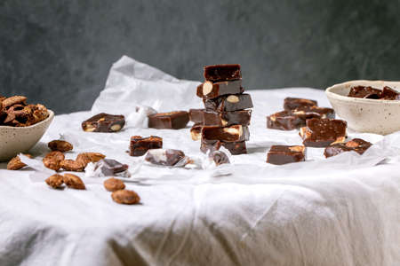 Homemade toffee salted caramel chocolate almond nuts candy on crumpled paper in row over white linen tablecloth. Handmade food sweet gifts for any holidays. Flat lay