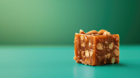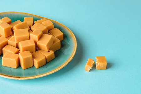 Close-up of caramel vanilla fudge on a turquoise ceramic plate over turquoise background. Fresh tasty candies made of milk and sugar. Square pieces of delicious soft sweets. Copy space.