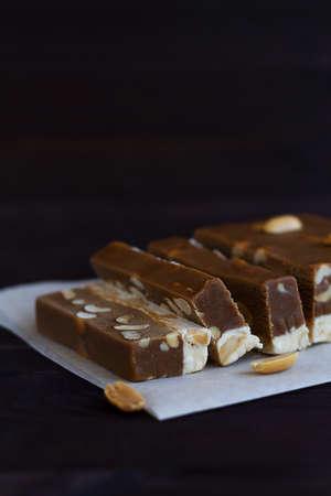 Homemade caramel candy with peanuts on a dark background. toning. selective focus