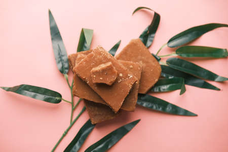 A stack of homemade caramel. Groups of caramel candy, isolated on the table counter at the market. Toffee caramel candy close-up isolated