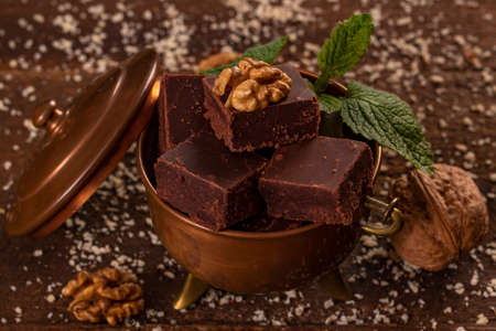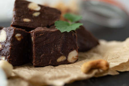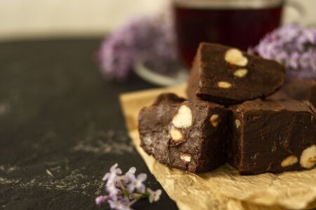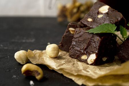 Homemade chocolate fudge garnished with mint leaves and served with tea on a black background. Nuts in the background blurred background. Copy space