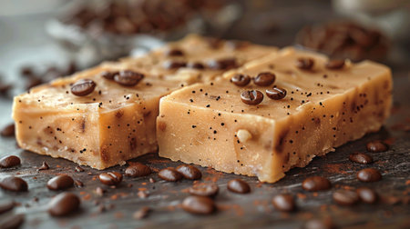 Delicious creamy caramel squares served on a rustic plate in a warm, inviting kitchen setting