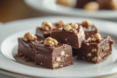 Closeup of chocolate with nuts on white plate, shallow depth of field