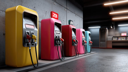 Vibrant and colorful gasoline pumps stand in a modern filling station, showcasing a blend of contemporary design and urban infrastructure. The scene highlights the sleek technology and convenience of fueling vehicles in a stylish setting.