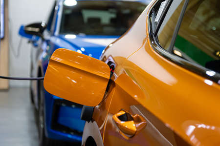 plug of the charging cable plugged into an electric car, charging an electric car at the station