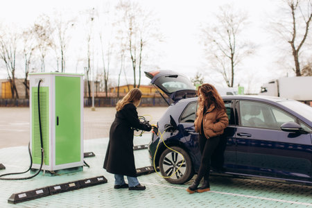 Woman plugging charging cable into electric vehicle at green charging station with friend nearby, focusing on sustainable transportation
