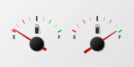 Vector 3d Realistic White Gas Fuel Tank Gauge, Oil Level Bar on White Background. Full and Empty. Car Dashboard Details. Fuel Indicator, Gas Meter, Sensor. Design Template