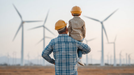 A heartwarming scene of a father holding his son on his shoulders amid a wind farm with turbines, illustrating the bond between generations and a commitment to sustainability.