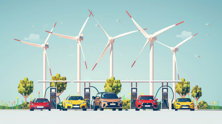 Electric vehicle charging station powered by windmills. Eco-Friendly Drive. Modern electric cars, utilizing eco-friendly energy sources to power transportation