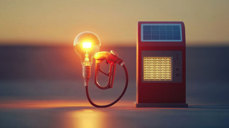 A creative representation of a fuel pump next to a glowing light bulb at sunset, symbolizing the fusion of energy and technology in the modern world.