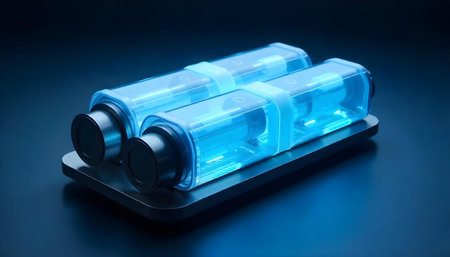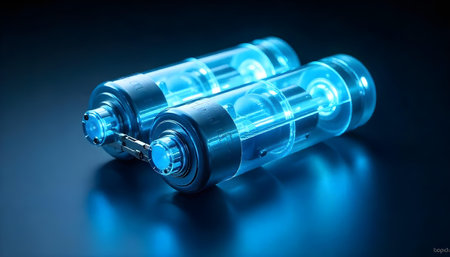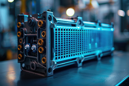 This close-up image showcases a battery cell in the process of being manufactured using advanced technology. The transparent design emphasizes its intricate components and glowing lights.