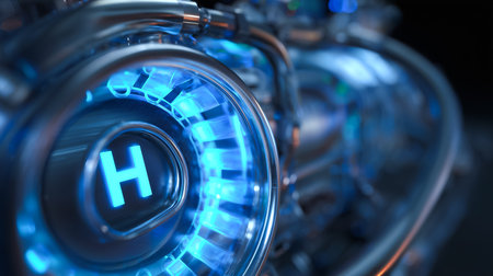 A futuristic hydrogen engine symbol on a chrome metal background depicting clean energy technology and alternative fuel concept. The H symbol and clean alternative source represents automotive