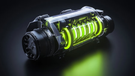 This vibrant battery pack showcases a transparent housing with glowing green lights, representing advanced energy storage technology. Ideal for innovation in electric applications.