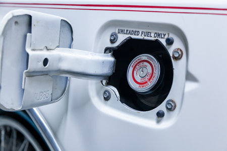 A close-up view of a fuel pump nozzle inserted into a car's gas tank. This image captures the process of refueling with gasoline at a gas station, emphasizing modern transportation and consumer behavior.