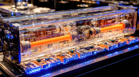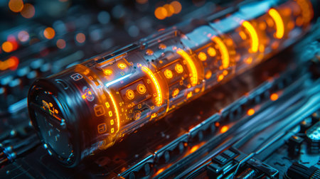 Futuristic mechanism inside a sleek cylinder glows with orange lights, showcasing advanced technology and innovation in science, engineering, and design