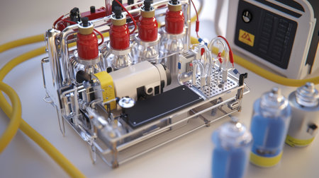 Close-up of an advanced energy cell in a bright lab. Swirling turquoise fluid glows inside a glass container, circulating through a futuristic metallic processing unit.