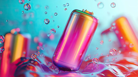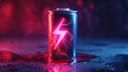 A futuristic electric battery with a lightning bolt symbol, illuminated by neon pink and blue lighting, symbolizing energy and power.