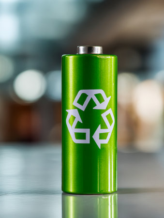 A vibrant green rechargeable battery featuring a universal recycling icon, symbolizing innovative eco-conscious energy devices and practices for a cleaner planet.