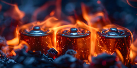 Illustrating the Risks of Lithium-Ion Battery Fires: Emphasizing Safety Measures and Fire Prevention in Battery Technology. Concept Lithium-Ion Battery Fires, Safety Measures, Fire Prevention