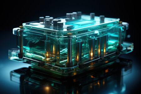 An illuminated, transparent electronic device showcases internal elements and complex circuitry. The design features a combination of metallic and plastic components, illuminated by a vivid blue and orange light scheme. The overall style is modern and technical, potentially suitable for presentations, educational materials, or commercial purposes.