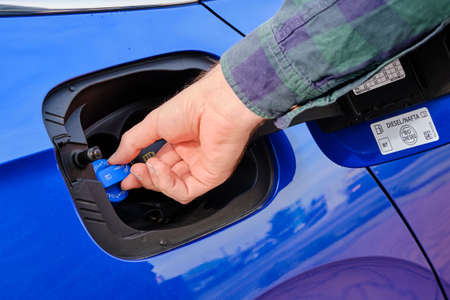 Close up mans hand opening a tank for Ad Blue fluid of a blue car. Diesel exhaust fluid or DEF for reduction of air pollution, October 2020, Prague, Czech Republic