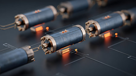 A striking arrangement of sleek battery cylinders in black and copper tones, perfect for showcasing modern energy solutions in a professional and artistic manner.