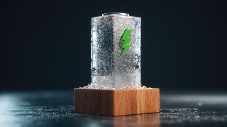 An artistic representation features a clear, crystalline structure resembling a battery, mounted on a wooden base. A green lightning bolt graphic is visible on the surface. The scene is illuminated by directed lighting against a dark background, suggesting a studio environment. This image is suitable for technological and energy-related design applications.