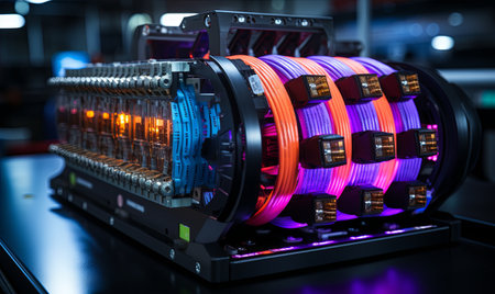 Close-up of a high-powered battery with blue and red lights.