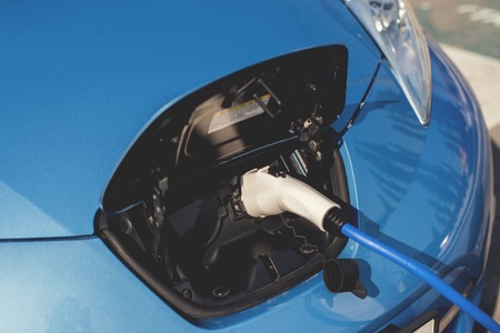 Charging an electric car. Close-up of a power source connected to a charging electrical vehicle.