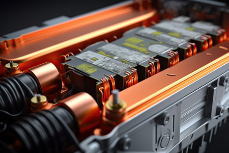 Explore a detailed close-up view of an electric vehicle battery compartment highlighting advanced power cells and modern technology, showcasing innovation in sustainable transport.