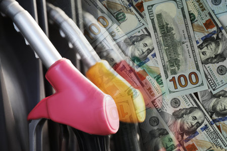 Fuel price. Gas filling station and dollar banknotes, double exposure