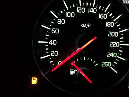 Illuminated modern car speedometer. Vehicle with empty fuel tank