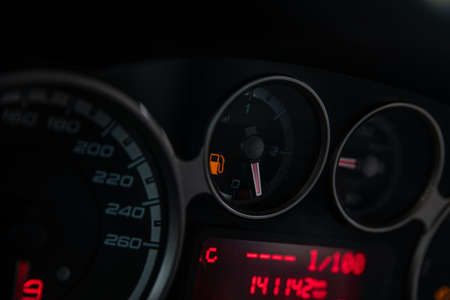 A fuel level their display stands on empty. Detail from the car cockpit, a symbol of the innovation of auto industry.