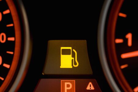 Low fuel level lamp on the dashboard. Close-up