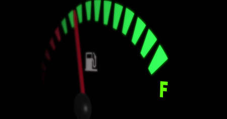 A closeup of a petrol gas gage showing the needle at full on a dark reflective background with copy space - 3D render