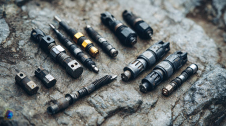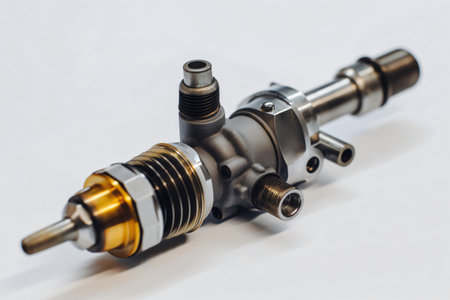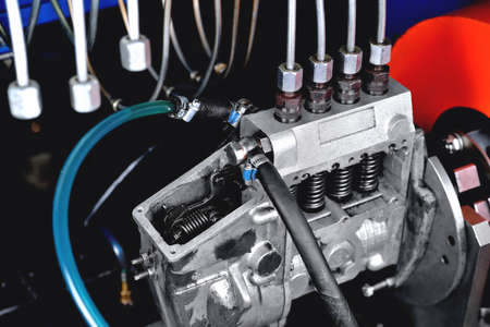 A fuel pump for a diesel engine after repair on an adjustment stand in a workshop, fuel pump repair, adjustment of fuel pump nozzles on a bench, fuel stand for pump adjustment, overhaul, close-up, selective focus