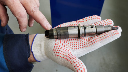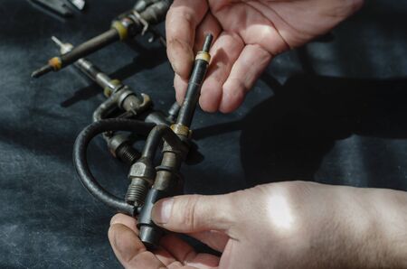 Hands hold fuel diesel injectors. A certified auto mechanic performs a visual inspection of the fuel injectors. A set of injectors for a turbo diesel engine on a table in a workshop. Car service. Selective focus.