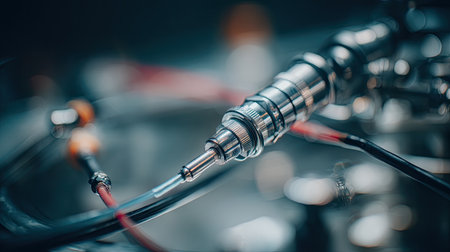 A sleek, precision-engineered metallic plug interfaces with a complex industrial system, surrounded by intricate machinery and flexible hoses in a manufacturing sett