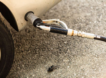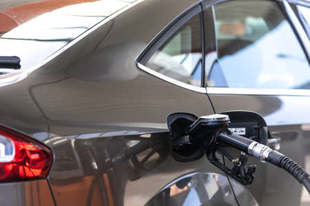 Auto refuel. Car at gas station being filled with fuel, fill up of liquefied petroleum gas, LPG