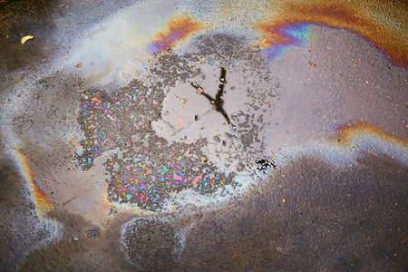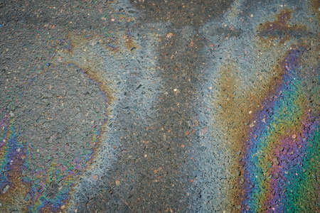 Color Gasoline fuel spots on Asphalt Road as Texture or Background. Environmental pollution concept