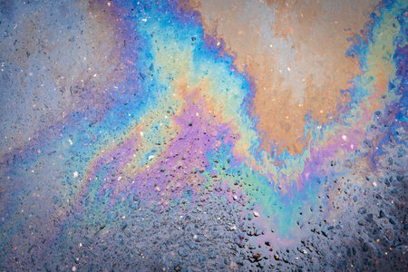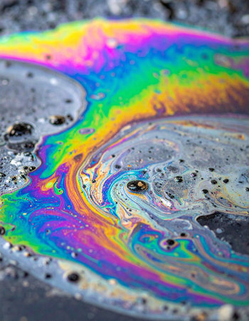Oil slick on water forming abstract iridescent patterns and colorful bubbles, symbolizing environmental pollution