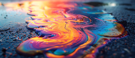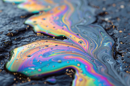 Colorful iridescent oil slick on a textured dark surface, showcasing vibrant patterns and shimmering hues. Nature and environmental concept, focusing on fluid dynamics.