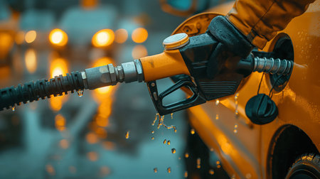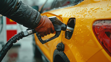 Close-up of a person refueling a yellow car with a gasoline pump at a service station. Hand and yellow refueling gun, Generative AI.
