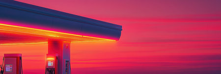 Bright gas station shines under a stunning gradient sunset, with glowing pump nozzle and vibrant hues of red and orange in the sky enhancing the atmosphere.